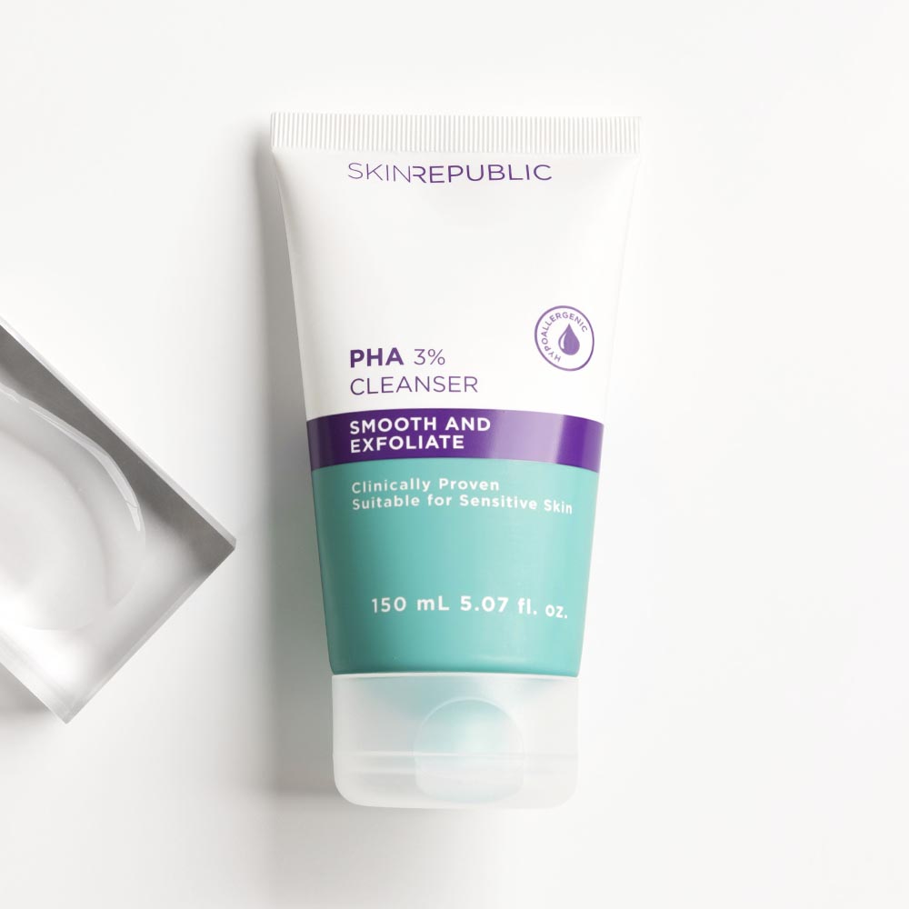 You would use the PHA 3% cleanser as the first step in your routine, both morning and night, to gently cleanse and exfoliate. The Skin Republic SPF 50 Niacinamide 5% Serum Stick, being an SPF product, is specifically for your morning routine.