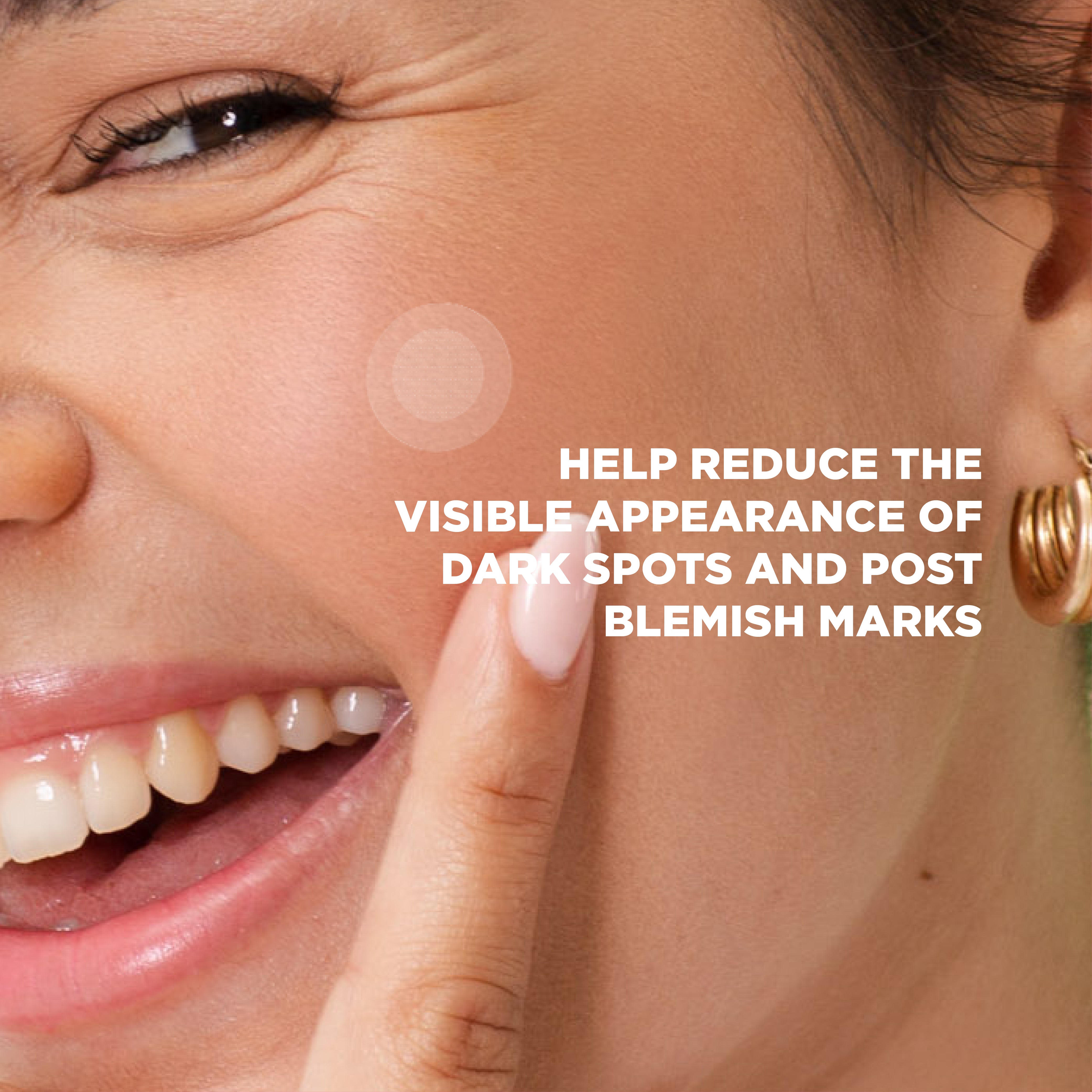 • Microdart patches infused with vitamin C, niacinamide and alpha arbutin help reduce the visible appearance of dark spots and post blemish marks